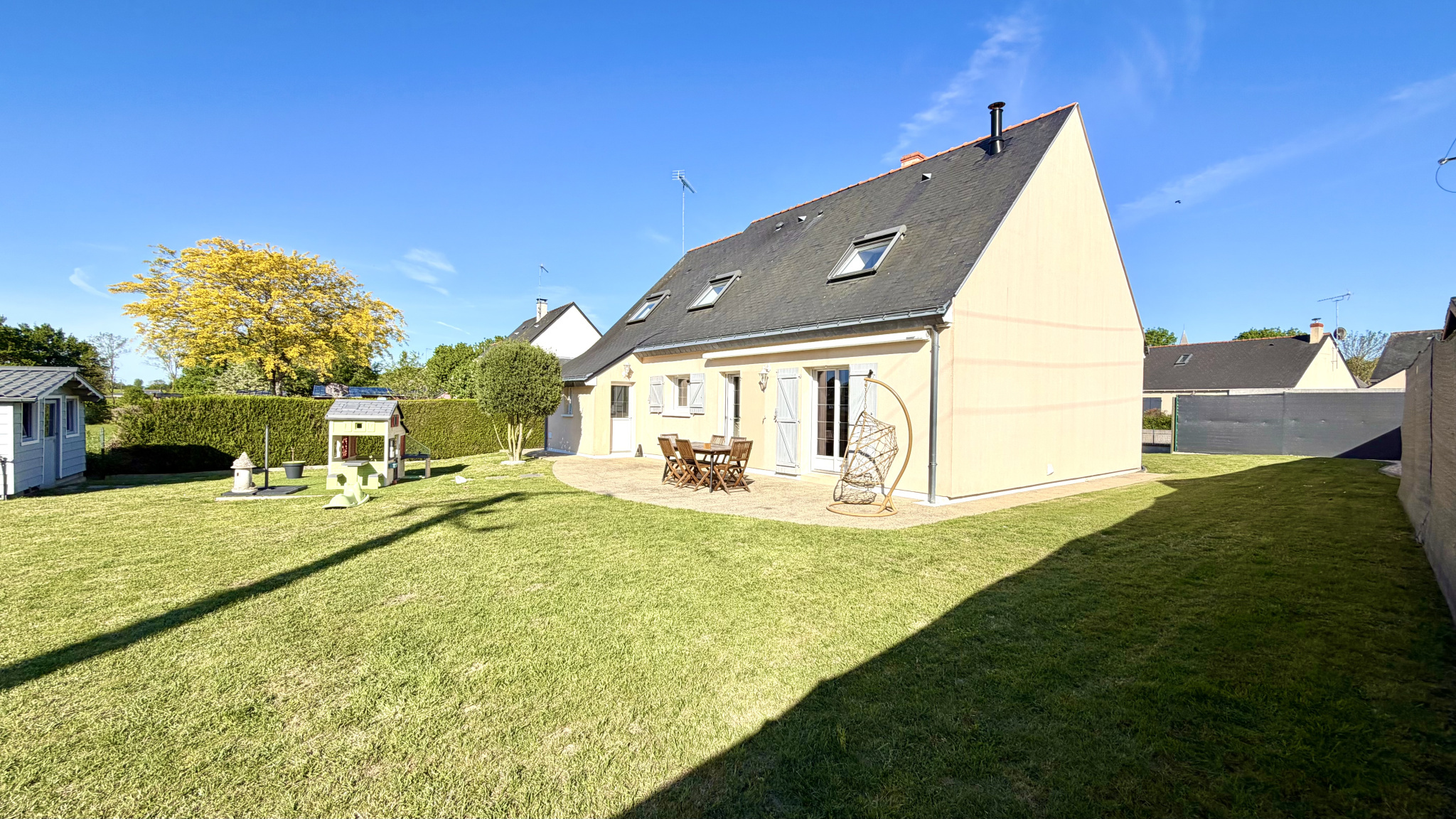 À l’extérieur, vous serez séduits par un magnifique terrain de plus de 710 m², parfait pour profiter des beaux jours en toute tranquillité. Deux abris de jardin ainsi qu’un garage viennent s’ajouter aux nombreux atouts de ce bien.