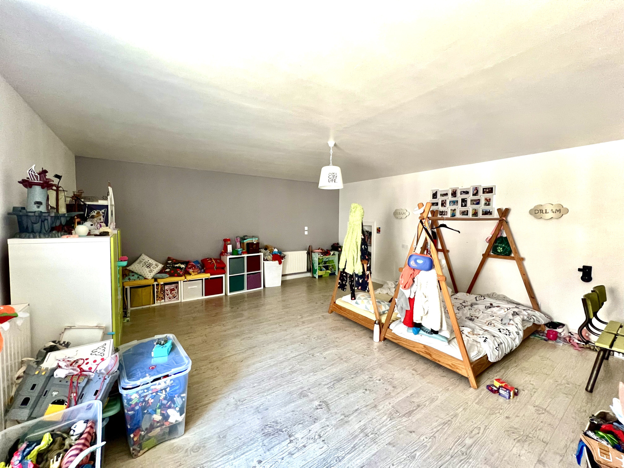 À l’étage, l’espace nuit offre deux belles chambres, dont une spacieuse pièce de 30m² laissant entrevoir la possibilité de créer une troisième chambre selon vos besoins.